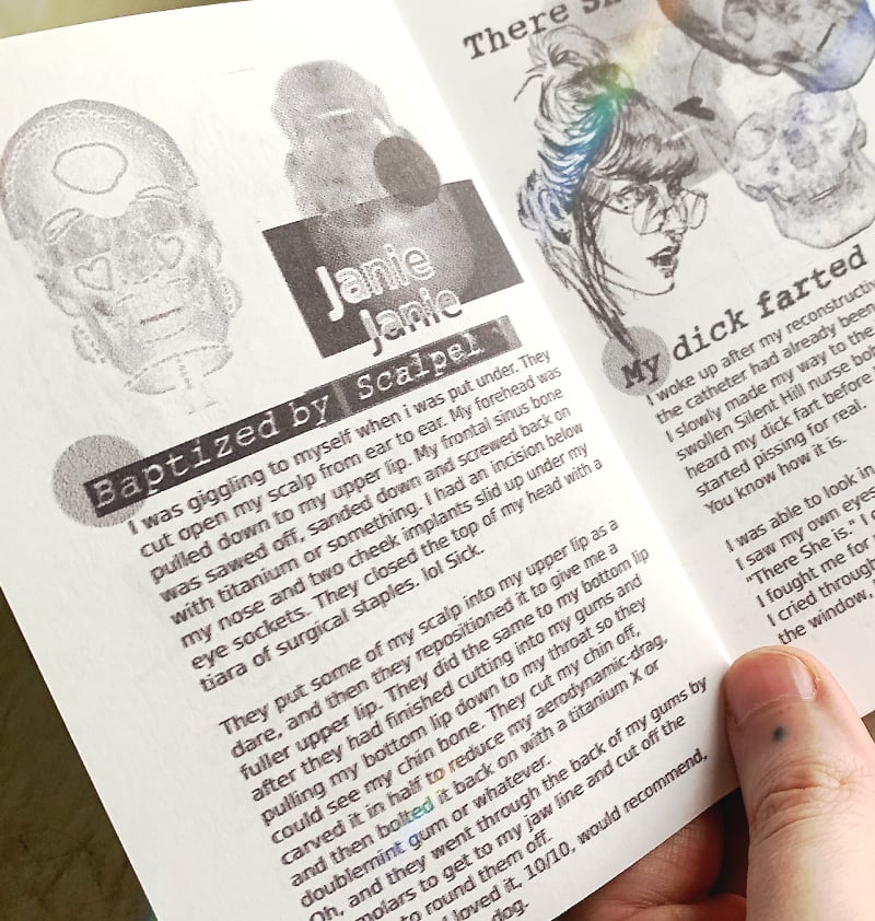 A dude named Kyle Cut MY Face Off and then My Dick farted. In this Zine I talk about many experiences i went through during the healing process of Facial Feminization Surgery / Reconstructive Surgery, Vices i experimented with, Horoscopes for 2025, Original Illustrations, Romantic Confessions, and Exquisite humor from some Trans Lady named Janie.